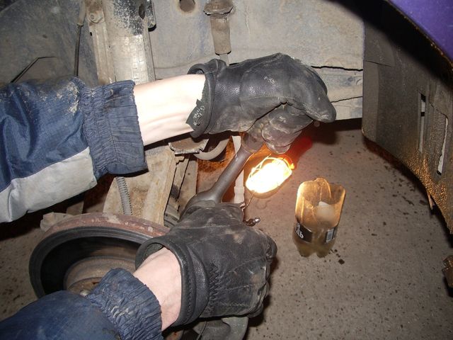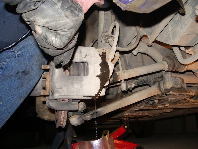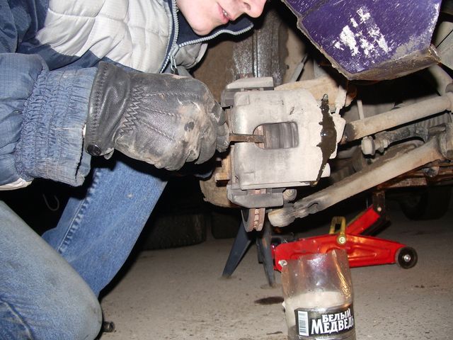 - Когда тормозная жидкость вытекла, необходимо отодвинуть колодку и стравить остатки жидкости.
