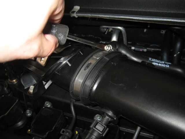 - Чтобы добраться до свечей мешает воздуховод, его придется демонтировать. Для начала необходимо ослабить хомут воздуховода.