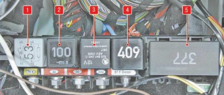 1 — реле звукового сигнала; 2 — коммутационное реле; 3 — усилитель освещения; 4 — реле топливного насоса; 5 — блок управления работой стеклоочистителя