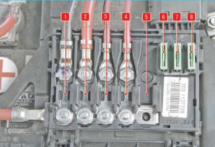 Плавкие перемычки и предохранители в монтажном блоке, расположенном в моторном отсеке Skoda Oktavia A4, Oktavia Tour