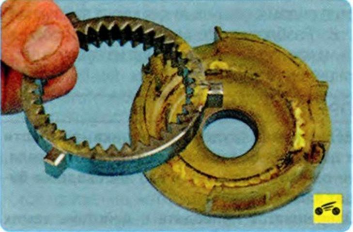 Подденьте отверткой… …и снимите стопорное кольцо. Снимите муфту с вала привода. …и извлеките из муфты ограничительное кольцо. - Проверяем износ зубьев муфты.