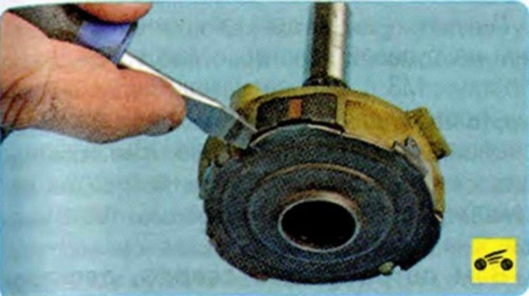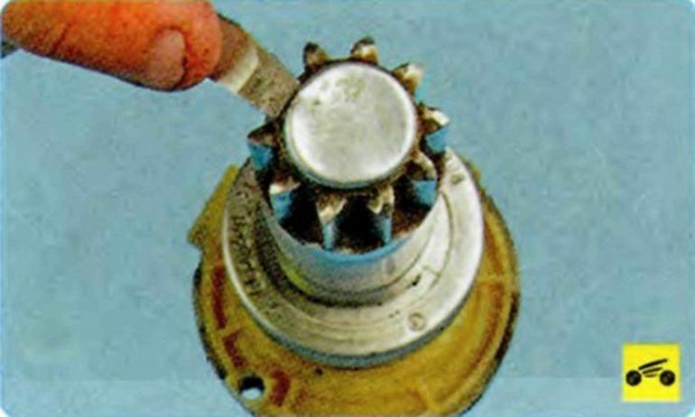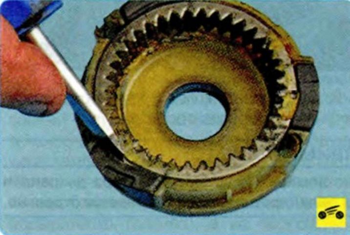 Поддев отверткой… …снимите маслоотражатель планетарного механизма. - Демонтируем три шестерни сателлита.