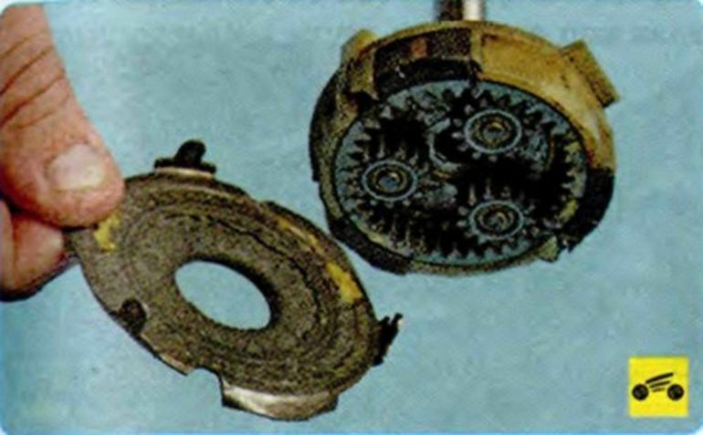 Проверьте муфту привода. Зубья и шестерни не должны быть значительно изношены. - Демонтируем маслоотражатель планетарного механизма.