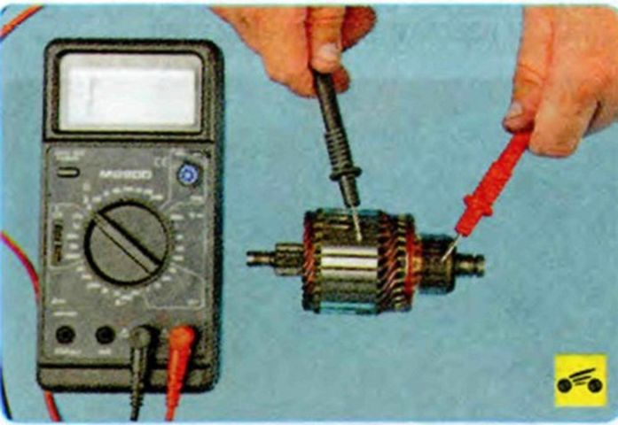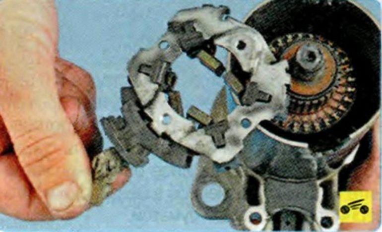 Выверните два винта крепления крышки подшипника… …и снимите крышку. - Тестером проверяем сопротивление щеточного узла.