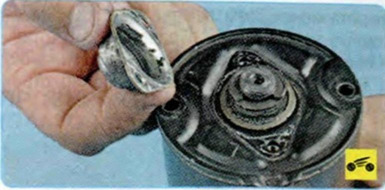 Снимите стопорное кольцо. …и упорное кольца ротора. Снимите крышку стартера… …и извлеките щеточный узел. - Снимаем крышку и извлекаем ротор со статора.