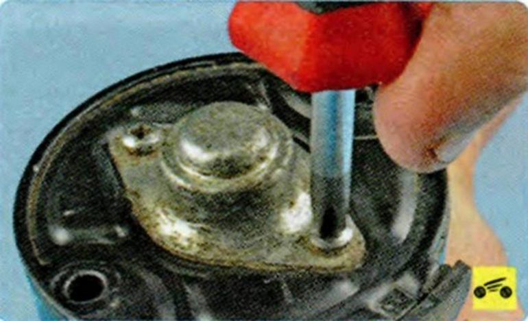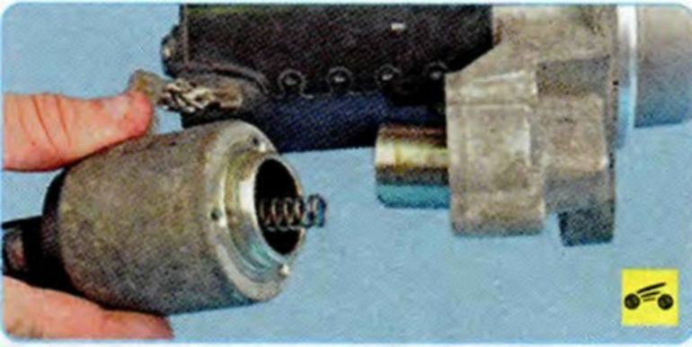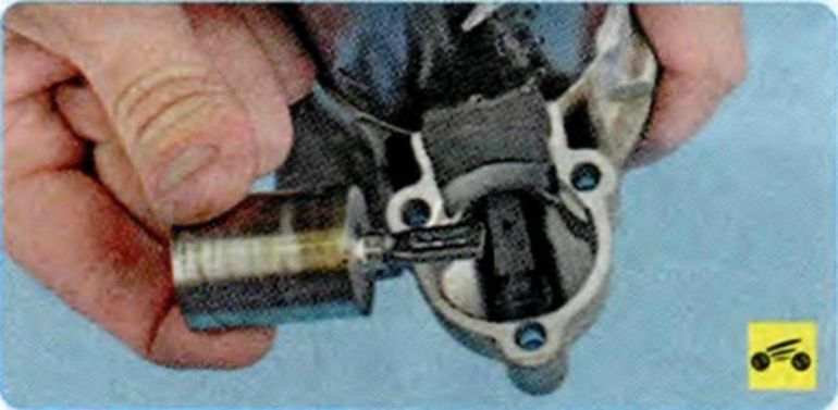 Снимите с рычага привода якорь тягового реле. Вставьте якорь в корпус тягового реле. Проверьте легкость перемещения якоря. - Откручиваем болты задней крышки и разбираем реле.