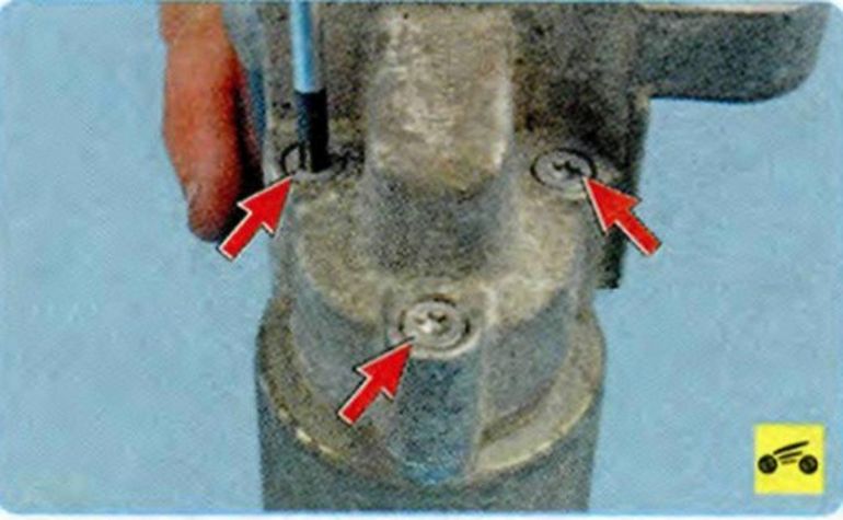 Выверните три винта крепления тягового реле к корпусу стартера со стороны привода… …и снимите корпус тягового реле. - Отсоединяем провод со стартера от тягового реле.