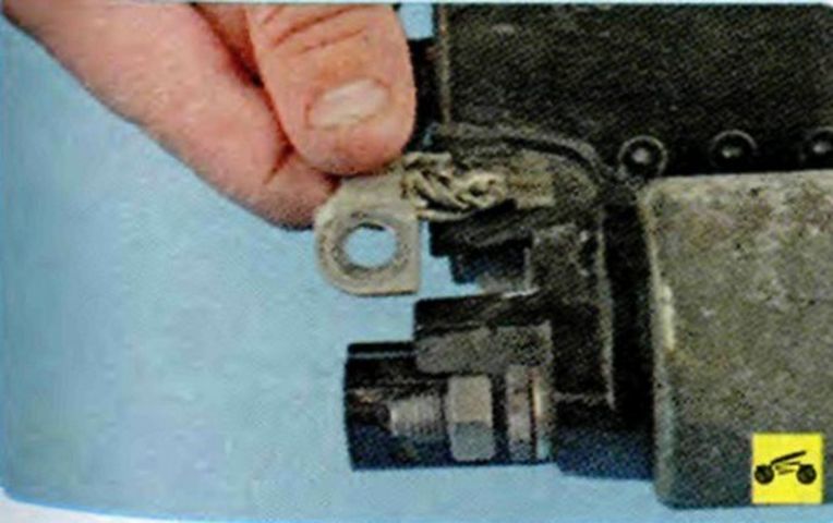 Отверните гайку крепления наконечника силового провода… …и снимите провод с контактного болта тягового реле. - Демонтируем верхний и нижний кронштейны крепления проводов.