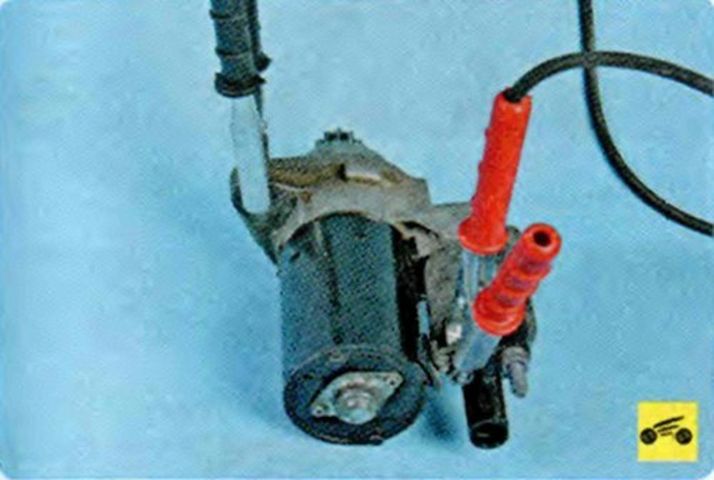 Отверните гайку крепления провода щеточного узла к контактному болту тягового реле… …и отсоедините клемму провода щеточного узла от болта. - Теперь присоединим провода, как показано на фото и проверим работоспособность стартера. Клеммы подключить к АБК.