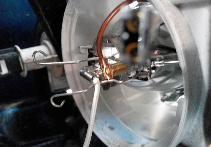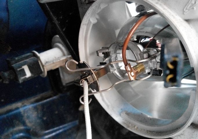 Находим провода питания… ….отсоединяем питание. - Надавливаем на лампу, чтобы отщелкнув скобу, вынимаем лампочку. Ставим новую.