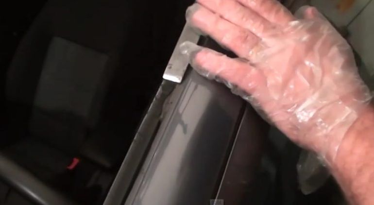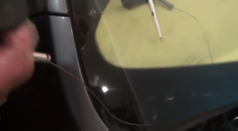 Продеваем нить для срезания стекла. Делаем отверстие для нити. Продеваем нить. - Этой нитью срезаем, аккуратно стекло и предварительно нацепив ручной фиксатор вынимаем лобовое стекло.
