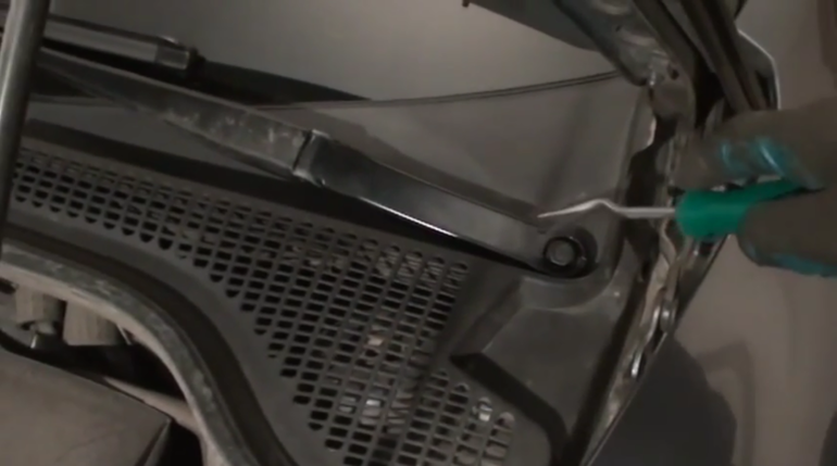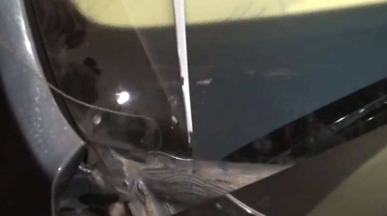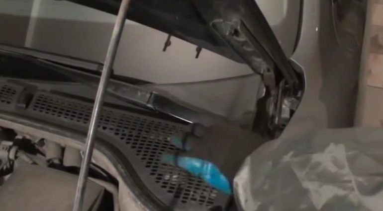 Снимаем накладку воздухозаборника ветрового стекла. Убираем накладку в сторону. - Далее, протыкаем шилом герметик между ветровым стеклом и кузовом и продеваем специальную нить с ручками для удаления стекол.